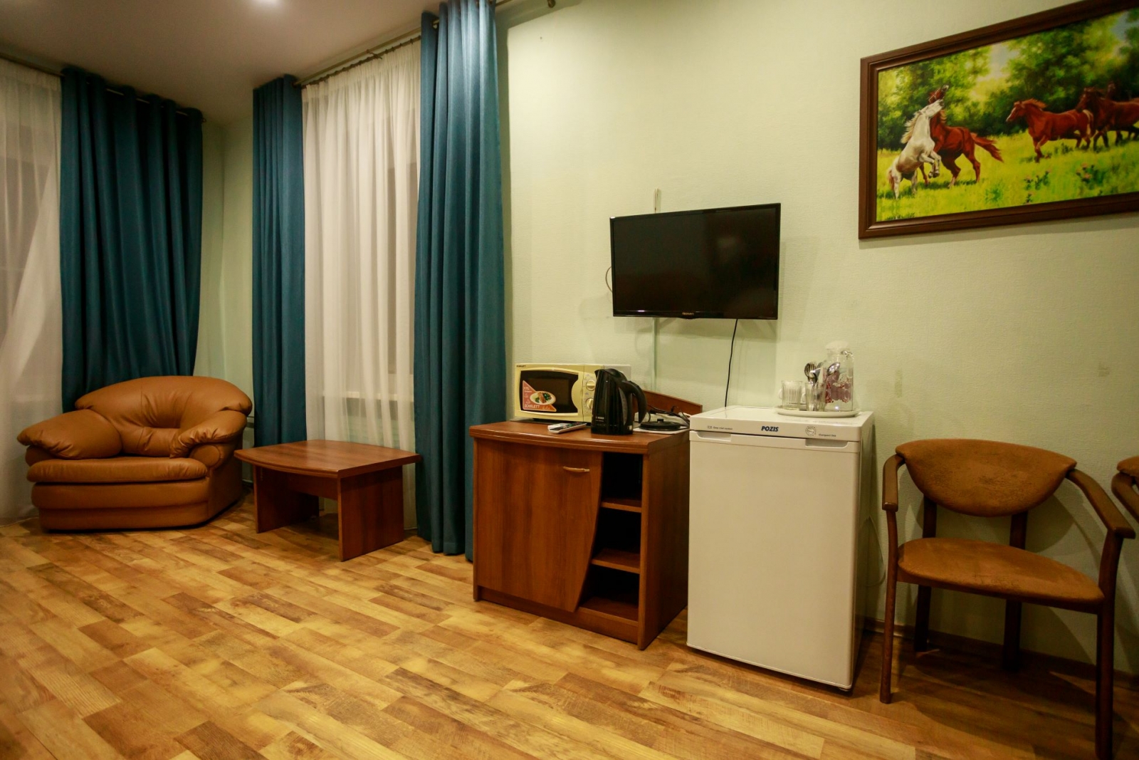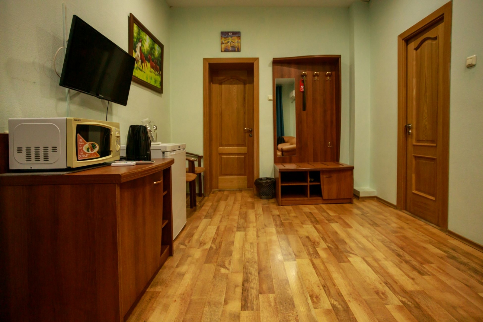 Оснащение: электрический чайник, сушилка, печь СВЧ, ТВ, фен, холодильник.